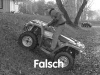 | Als erstes musst Du eine entspannte und bequeme Sitzposition einnehmen, damit ein unverkrampftes Fahren möglich ist. Bitte nie stehend das ATV bewegen, dies ist gefährlich. Für eine ruhige und komfortable Fahrt ist es sicherlich auch von Vorteil, wenn Du ein wenig auf den Rücken achtest und diesen möglichst gerade hältst. Mögliche Beifahrer oder Beifahrerinnen müssen sich immer um den Bauch des Fahrers oder der Fahrerin festhalten. Sonst kann es passieren, dass bei ruppigen Fahrmanövern oder Schlägen der Beifahrer oder die Beifahrerin verloren geht. Was wir aber im Normalfall sehr schnell merken und locker ein Stück zurücksetzen! | ![]() |
